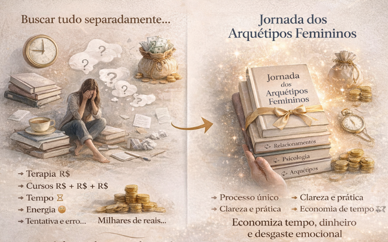 Terapia presencial para compreender padrões emocionais, cursos avulsos sobre relacionamentos, psicologia profunda e arquétipos, além do tempo e da energia gastos tentando aplicar tudo sozinha — costuma gerar um investimento que ultrapassa facilmente milhares de reais, sem um método integrado e sem acompanhamento contínuo.